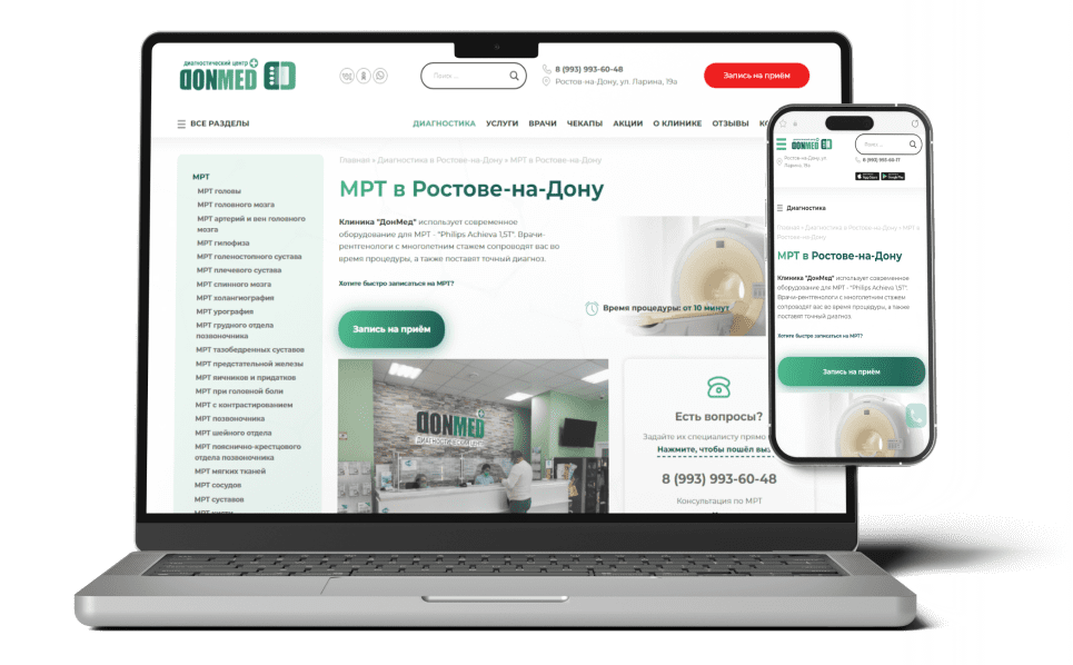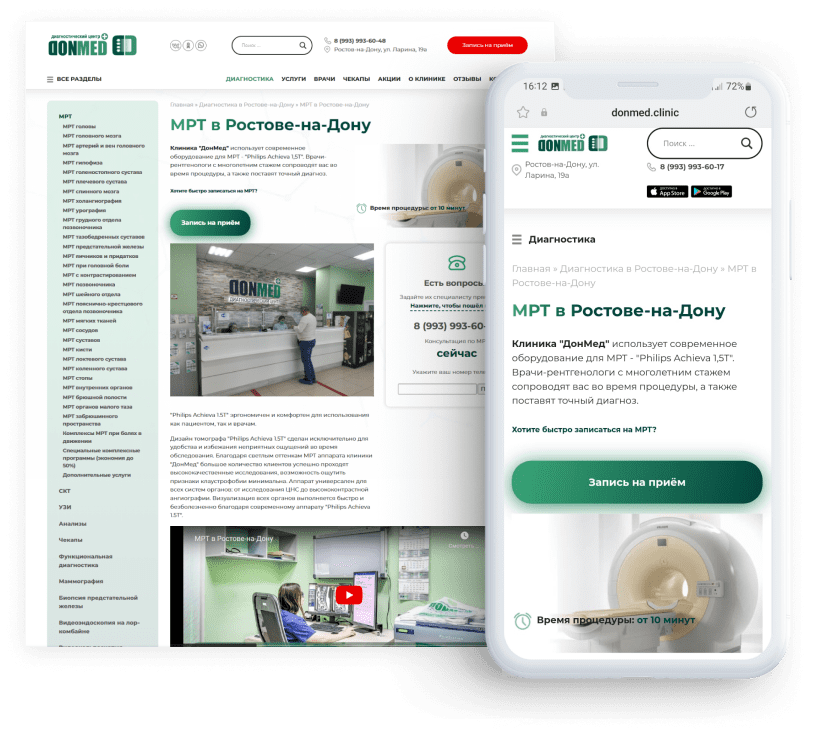 В структуру будущего сайта мы заложили страницы, которые особенно полезны для пациентов - диагностика МРТ, КТ, УЗИ, направления врачебной помощи, лабораторные анализы.