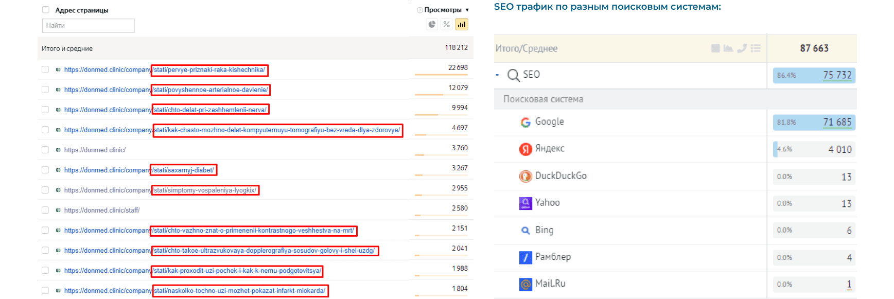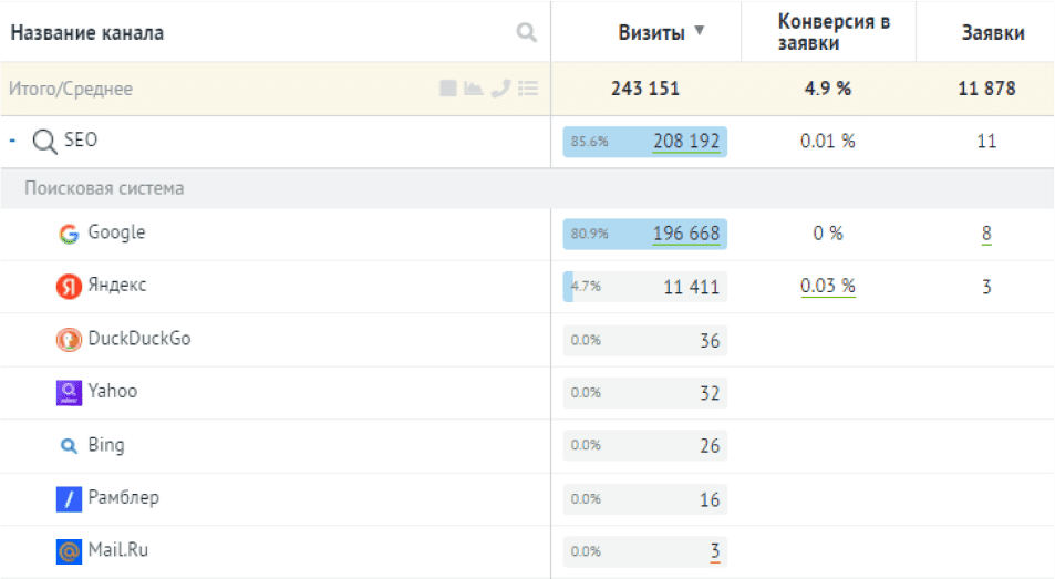 SEO трафик и обращения с SEO можно рассматривать с нескольких сторон. Обычно SEO трафик анализируют по Яндекс/Google метрике как общее количество трафика и обращений.