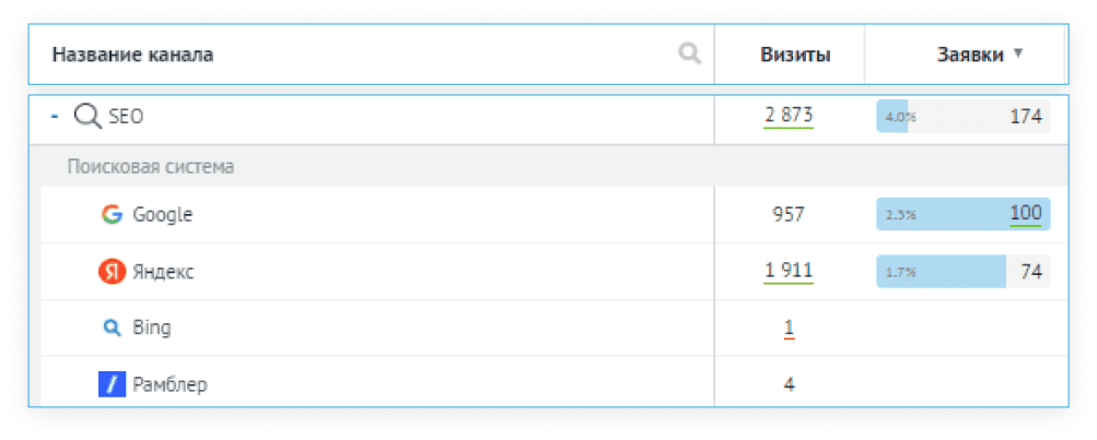 Мы задействовали сквозную аналитику Roistat. В результате мы можем видеть количество заявок по каждой поисковой системе.